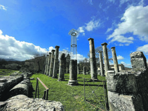 progetto, la giovane scultrice Francesca Siano -. Il mio intento, come scultrice, è stato quello di recuperare le forme che un tempo esprimevano armonia e proporzione, disponendole nello spazio nella loro completezza. In tale contesto si è cercato di raccontare il luogo attraverso la ricostruzione di colonne risalenti all’età romana mediante l’utilizzo di una rete metallica a maglia stretta la cui trasparenza aiuta ad immergersi nella storia passata e allo stesso tempo ci fa capire che è possibile andare avanti e ricercare la storia stessa con materiali che oggi ritroviamo nella quotidianità – racconta -. L’utilizzo della rete metallica e della trasparenza permettono di rappresentare la dimensione immateriale delle opere e il loro rapporto con il contesto. Un’architettura immateriale, onirica, quasi un disegno, in cui la maestosità dell’edificio e la leggerezza della trasparenza coesistono in un dialogo aperto tra antico e contemporaneo».