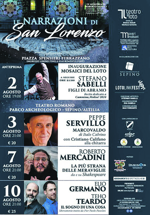 Insomma, tre nuove e meravigliose notti d’agosto, da trascorrere in uno dei luoghi più iconici del Molise, il Parco Archeologico di Sepino ad ascoltare storie. Come si faceva un tempo sull’aia, in attesa delle stelle cadenti. «Quelle scie luminose che tutti, dopo le narrazioni, ci impegneremo a cogliere in cielo per rinnovare lo spirito della nostra vita, connetterci meglio a quella di chi ci sarà seduto vicino e ritrovare quella di chi ci manca – dicono dal Teatro del Loto -. Noi, in particolare, cercheremo di cogliere quella stella, quella scia di luce che il 10 agosto, a chiusura della rassegna, nel giorno in cui avrebbe compiuto il suo 67esimo anno, meglio ci connetterà al ricordo di Roberto Sabelli, progettista del Teatro del Loto, archeologo e studioso di valore internazionale, che tanto manca alla sua famiglia e a tutta la comunità del Loto».