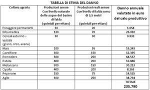 E veniva stimato il danno legato alla semplice riduzione della produzione delle varie colture, che “ottenuto per differenza tra il valore delle produzioni potenziali dell’area e il valore delle produzioni reali ottenibili con una falda a 3,5 metri (di profondità) ammonta a 235.790 euro annui” – spiegavano.