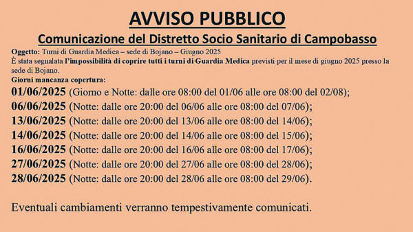 Alla fine, il problema della carenza di medici si abbatte anche sull’area matesina: il servizio di guardia medica di Bojano subirà significative interruzioni durante il mese di giugno. A comunicarlo, con un avviso pubblico, il distretto socio sanitario di Campobasso che ha evidenziato l’impossibilità di garantire la copertura di tutti i turni programmati presso il poliambulatorio del capoluogo del Matese, che serve una vasta area che richiama numerosi centri limitrofi per un bacino di utenza che supera le 10mila unità.