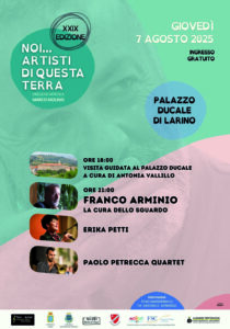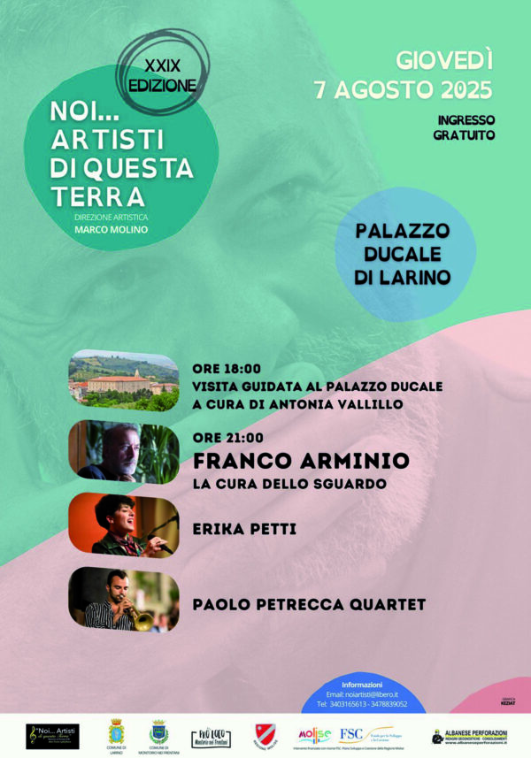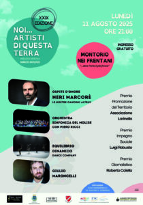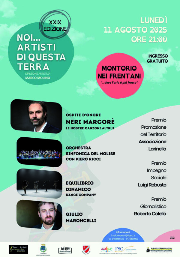 L’Associazione culturale ‘Noi Artisti di Questa Terra’ anche quest’anno ci dà appuntamento a Montorio (dove l’aria è più fresca) prolungando in tre serate la manifestazione che ha preso il via il 6 di agosto e, ci invita per le serate del 7 e del’11 per questa che è appunto la ‘XXIX edizione Noi…Artisti di Questa Terra’, iniziativa di carattere artistico e culturale, sostenuta dalla Regione Molise ad assaporare l’ospitalità che Larino è in grado di offrire.