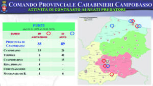 Alti pure i dati dei furti d’auto: 89 complessivi di cui 42 a Termoli, 26 a Campobasso 15 a Campomarino e 6 Montenero di Bisaccia.