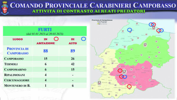 Il trend è in preoccupante crescita ed i numeri lo certificano: 88 colpi in abitazione e 89 furti d’auto messi a segno nella provincia di Campobasso dal 1° gennaio al 20 marzo. Si tratta però solo dei casi denunciati ai Carabinieri, dunque alla ‘lista’ vanno aggiunti anche tutti quei tentativi di furto che non sono stati inseriti nel ‘database’ dell’Arma, ma su cui i militari stanno comunque lavorando dopo aver ricevuto numerose segnalazioni da cittadini e sindaci.