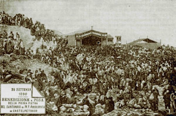 baracche, parte fatte in legno, parte ricoperte di tende, ed una di esse parata discretamente, servì di cappella per la funzione religiosa. A sinistra sorgeva un pulpito per gli oratori sacri, e più giù un’altra capanna dove era apparecchiato un buffet per gli invitati, ai quali pure era serbato uno spazio in mezzo ad uno steccato di forma rettangolare. Carlo Acquaderni, fratello del conte, ed Augusto suo figlio, facevano gli onori di casa accompagnati dal prof. D’Uva di Castelpetroso e da molte altre persone del luogo. Tutto procedé con ordine, rispetto alla moltitudine di gente che vi accorse, e faccio perciò le mie congratulazioni col comitato, come debbo farle al sig. E. Forte, autore delle seguenti iscrizioni che si leggevano ai lati della cappella. I. – Echeggeranno/Su queste balze/ Sin ad oggi abbandonate/ Assieme al canto dell’allodola/ gli inni/ Dei pellegrini del mondo/ che verranno/ A sciogliere il voto e la preghiera/ Alla Madre di Dio. XXVIII Settembre 1890.// II. – Plebiscito di fede/ Entusiasmo di popolo/ Dall’un capo all’altro d’Italia/ gittano/ Oggi la prima pietra/ di/ Un santuario/ che/ Per infuriare di venti e per trascorrere di secoli/ Rimarrà incrollabile/ a/ Testimoniare/ La grandezza di Dio./ XXVIII Settembre 1890. Alle 9 e mezzo circa giungono Monsignor Renzullo, Vescovo di Isernia, Monsignor Tempesta, Vescovo di Trivento, e poco dopo i Vescovi Macarone di Boiano e Di Nonno di Termoli. Finalmente una lunga fila di confraternita, accompagnate dalla Banda Municipale di Pretoro, da Castelpetroso reca l’immagine dell’Addolorata nella cappella costruita per l’occasione».