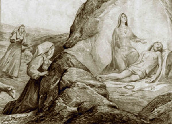 Il 22 marzo 1888, la tranquillità della diocesi di Bojano, ma soprattutto di Castelpetroso, piccolo centro di circa 3mila anime, fu sconvolta da un avvenimento prodigioso. Nella frazione di Cesa tra Santi, due contadine, Fabiana Cicchino, detta Bibiana, e Serafina Valentino, di 35 e 34 anni, erano alla ricerca di una pecorella dispersa mentre erano impegnate a zappare in un piccolo appezzamento, quando Bibiana fu attirata dalla luce proveniente da una grotta. Avvicinatasi, con grande stupore vide una visione celeste: la Madonna con le braccia allargate, il cuore trafitto da sette spade e con lo sguardo rivolto verso il cielo, inginocchiata davanti al corpo di Gesù morto coperto di ferite e sangue, senza profferire parola. Serafina, accorsa sul posto, invece, non vide nulla. Dieci giorni dopo, 1º aprile, giorno di Pasqua (anche quest’anno Pasqua cade il 1° aprile), l’apparizione avvenne nuovamente e questa volta la Madonna fu vista anche da lei.