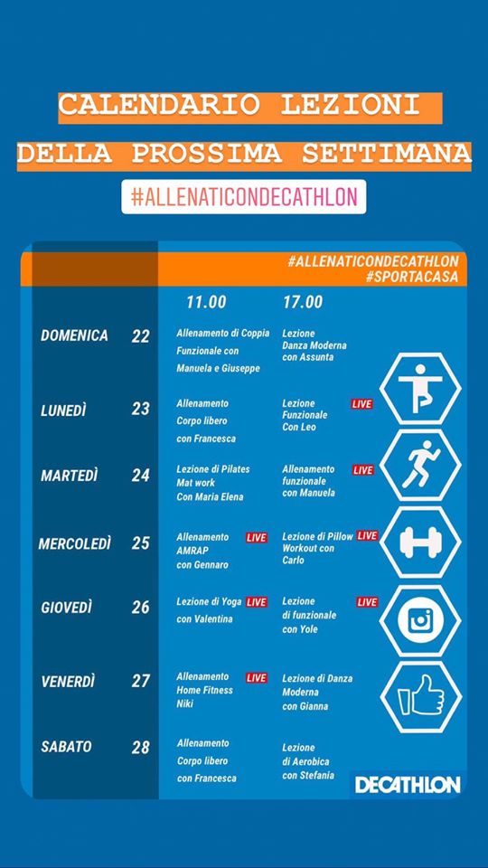 Le sessioni di allenamento, insieme agli esperti, sono pubblicate all’interno della pagina facebook dell’evento “Allenati con Decathlon” al link: https://facebook.com/events/s/allenati-con-decathlon/258116658516351/?ti=as.