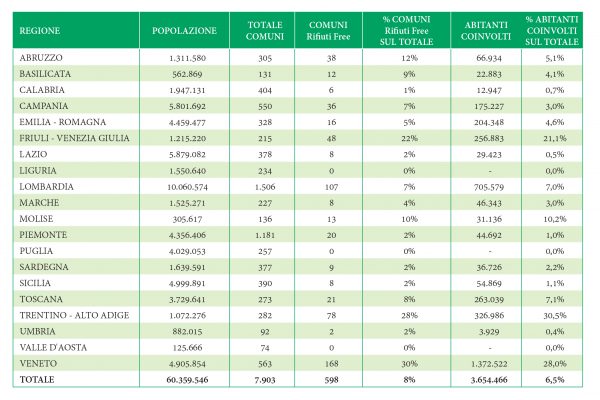 Il Veneto si conferma la Regione con il numero più elevato di Comuni rifiuti free: 168 comuni per una percentuale sul totale del 30%, stabile rispetto allo scorso anno. Seguono il Trentino-Alto Adige con 78 comuni (28%), due in più rispetto al 2019 che lo aveva visto in forte crescita, e il Friuli-Venezia Giulia, che con 48 comuni rimane a quota 22%. Poi l’Abruzzo e il Molise che passa da nove a 13 comuni (dal 7% al 10%).