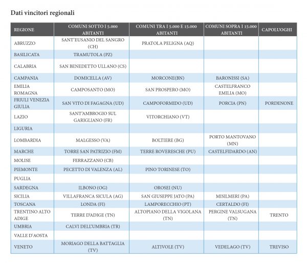 Tra i comuni non capoluogo sopra i 15 mila abitanti, oltre a Misilmeri (PA), i vincitori di quest’anno sono Baronissi (SA), Castelfranco Emilia (MO), Porcia (PN), Porto Mantovano (MN), Castelfidardo (AN), Certaldo (FI), Pergine Valsugana (TN) e Vedelago (TV). Carpi (71mila abitanti) tra i vincitori 2019 passa invece in seconda linea.