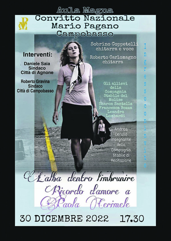 musicista agnonese. La parte recitativa vede invece protagonisti i giovani e bravi attori allievi della Cerimele: Sharon Santella, Francesca Bozza e Leandro Lombardi, oltre ad un intervento di Andrea Cerullo, maestro della compagnia Stabile. Gli interventi saranno accompagnati dalle immagini della vita di Paola e da un passaggio recitativo della Divina Commedia, a lei molto cara. Interverranno i due sindaci delle città che l’hanno vista attiva cittadina, Daniele Saia, sindaco di Agnone e Roberto Gravina, Sindaco di Campobasso. L’evento è stato curato dalla professoressa Rosa Maria Socci, profondamente legata a Paola Cerimele. «Un ringraziamento speciale va al rettore del Convitto Nazionale Mario Pagano – sottolinea Rosa Socci – la professoressa Rossella Gianfagna, che ha accolto nell’ Aula Magna questo evento che la città di Campobasso vede come moralmente ed affettuosamente doveroso. Il ricordo a Paola ha inizio alle 17.30 con ingresso libero a chiunque voglia partecipare con un personale saluto».