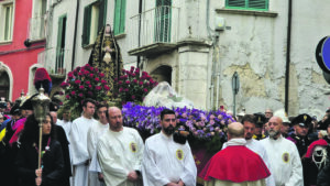 coinvolgente rito sacro. I 700 cantori diretti dal maestro Antonio Colasurdo, tutti vestiti di nero, gli uomini da un lato, le donne, col capo velato, dall’altro. Dalla chiesa di Santa Maria della Croce, dove un tempo sorgeva la sede dei Crociati, le statue del Cristo morto e della Madonna addolorata, protette da una folla di fedeli, iniziano la loro marcia. Le note del Teco Vorrei, alternate ai versi del rosario, inondano il cuore del centro storico e commuovono le migliaia di persone accorse in città. Poco prima delle 20 il corteo arriva in via Cavour per il momento forse più toccante e suggestivo della processione: la sosta davanti all’ingresso della Casa Circondariale dove, un detenuto (ex art.21) recita sul piazzale antistante la “preghiera del detenuto alla Vergine Addolorata”.