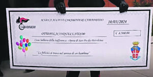 Dopo una breve visita guidata presso il Santuario di Santa Maria delle Grazie e la partecipazione alla santa messa, una delegazione di allievi Carabinieri, accompagnati da ufficiali della Scuola di Campobasso e dell’Arma territoriale, si è recata presso la Casa Sollievo della Sofferenza, dove ha donato ai bimbi ricoverati giocattoli e uova pasquali, nella speranza di aver regalato momenti di felicità e spensieratezza ai piccoli degenti. A seguire, ai responsabili della struttura sanitaria è stato consegnato un assegno di 8.500 euro per l’acquisto di un bene che verrà individuato d’intesa e che potrà testimoniare nel tempo l’affettuosa vicinanza dell’Arma.