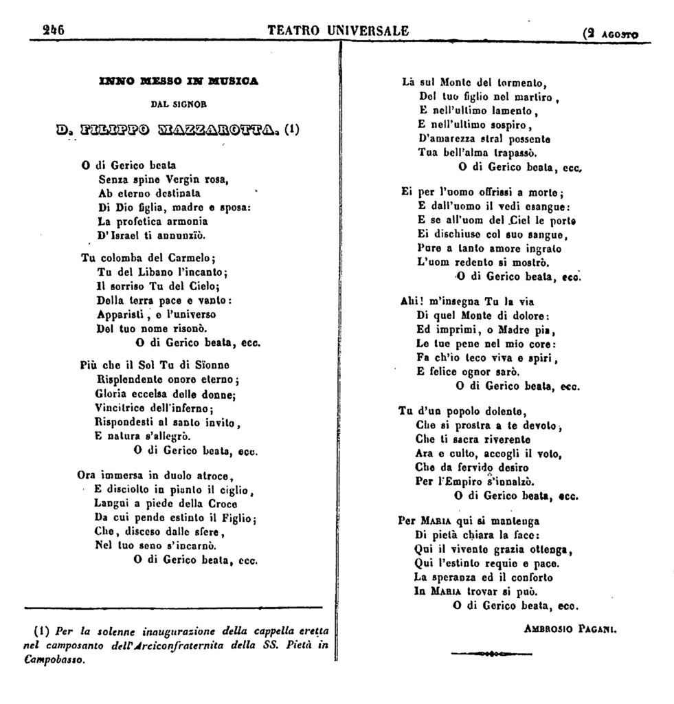 Bene, proprio in riferimento a questo monumentale Inno all’Addolorata, è saltato fuori un importante documento del 1845 che ho presentato in anteprima a conclusione della ricordata conversazione. In data 2 agosto 1845 il settimanale torinese “Teatro universale”, la prima rivista illustrata italiana, edita dal famoso tipografo Giuseppe Pomba che di lì a pochi anni avrebbe fondato la Utet, pubblicava il testo dell’Inno musicato da D. Filippo Mazzarotta, su versi del poeta Ambrosio Pagani: due maggiorenti campobassani non del tutto sconosciuti, come vedremo, i quali centottanta anni fa pubblicavano all’estero, perché Torino, allora era estero, capitale del Regno di Sardegna, con buona pace del luogo comune dell’isolato Molise, allora parte del Regno delle Due Sicilie, chiuso al mondo.
