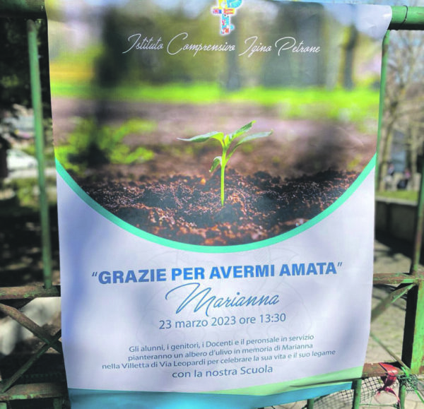Intorno alle 13.30 un momento di preghiera e di riflessione insieme a padre Gianpaolo, parroco della Mater Ecclesiae, seguito dalla benedizione dell’ulivo messo a dimora nel terreno del parchetto quale simbolo di pace e di amore che dura nel tempo. Un albero stabile e forte come il ricordo e l’affetto che i presenti continuano a nutrire nei confronti di Marianna.