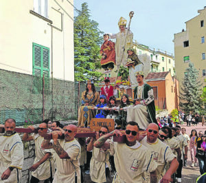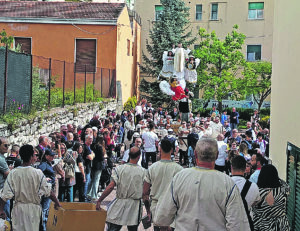 Intorno a mezzogiorno la tappa a Palazzo San Giorgio dove gli Ingegni hanno ricevuto la benedizione del vescovo che ha rivolto un ringraziamento ai portatori e all’intera associazione, con un pensiero particolare ai bambini, veri protagonisti della sfilata.