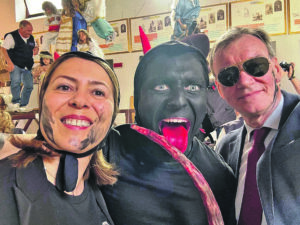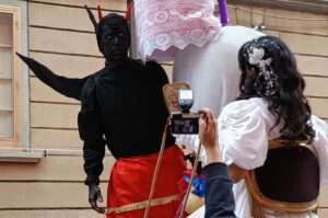 Giunti in via Mazzini, davanti alla Curia, i diavoli, con la simpatia che li contraddistingue, hanno coinvolto il vescovo Colaianni in un insolito siparietto. Alle urla del personaggio interpretato da Italo Stivaletti il prelato ha risposto con una ‘linguaccia’, mentre di fronte alle insistenti richieste dei diavoli di San Michele Colaianni ha fatto pervenire la sua offerta ‘lanciando’ dei soldi dalla balconata.