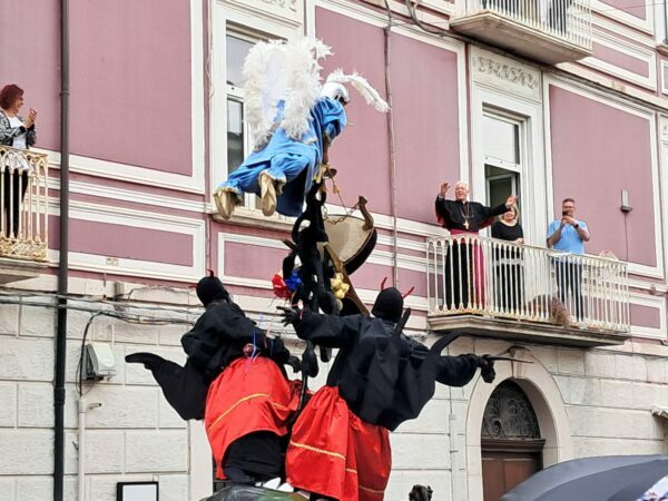 La processione, come da copione, si è incamminata verso il centro storico sulle note del Mosè di Rossini. In via Ziccardi il consueto omaggio di fronte la casa del Di Zinno, ‘padre’ dei Misteri. Il corteo si è poi mosso verso il centro cittadino dove ha trovato un fiume di persone ad attenderlo. Bambini e adulti con il naso all’insù hanno dato la carica ai protagonisti con urla di gioia e applausi scroscianti. ‘Buona la prima’ anche per la tunzella Valeria Ramacciato che è riuscita a non cedere alle provocazioni regalando al pubblico una performance degna di nota.