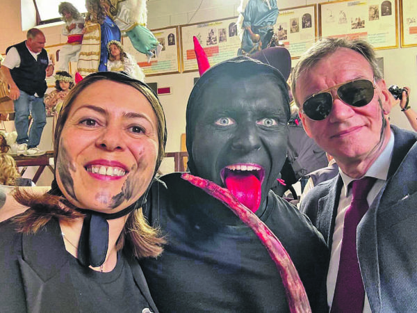Giunti in via Mazzini, davanti alla Curia, i diavoli, con la simpatia che li contraddistingue, hanno coinvolto il vescovo Colaianni in un insolito siparietto. Alle urla del personaggio interpretato da Italo Stivaletti il prelato ha risposto con una ‘linguaccia’, mentre di fronte alle insistenti richieste dei diavoli di San Michele Colaianni ha fatto pervenire la sua offerta ‘lanciando’ dei soldi dalla balconata.