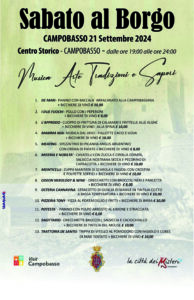 Sabato 21 settembre, però, è tanto altro: chiese aperte, Museo Sannitico , con ingresso gratuito, aperto fino alle 24; la tradizione del Gruppo Folkloristico Polifonica Monforte; giochi del passato in Piazza Pepe con Borgo della Salute; i giochi da tavola organizzati dall’associazione Argonauti in Piazzetta Palombo, musica di Licei e Conservatorio, omaggio a Fred Buongusto; negozi aperti con sconti e promozioni e un’offerta gastronomica di alto livello.