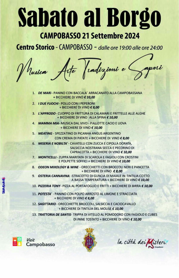 un’esperienza a 360 gradi che abbracci la cultura, la musica e le eccellenze enogastronomiche. Una boccata d’ossigeno anche per le tante attività commerciali della zona che negli anni hanno dovuto fare i conti più delle altre con la crisi economica. Nelle scorse ore è stato anche reso noto il menù (a prezzi calmierati) della serata all’insegna della tradizione campobassana, curato dai 13 ristoranti che hanno aderito all’iniziativa. Soddisfatto l’assessore alle attività produttive Giose Trivisonno che ha ‘incassato’ anche l’apprezzamento dell’opposizione, uno su tutti il capogruppo dei Popolari Salvatore Colagiovanni che, in passato, ha ricoperto il medesimo ruolo in giunta.