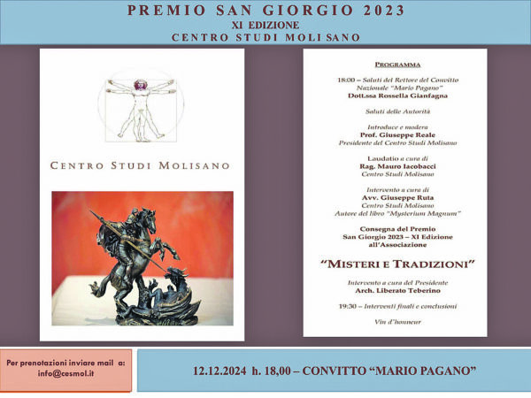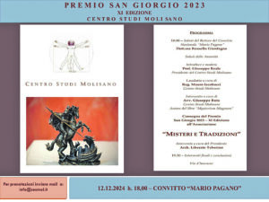 Per l’anno 2023 – XI Edizione – il Consiglio Direttivo Centro Studi Molisano ha conferito il Premio San Giorgio alla «Associazione Misteri e Tradizioni» di Campobasso.