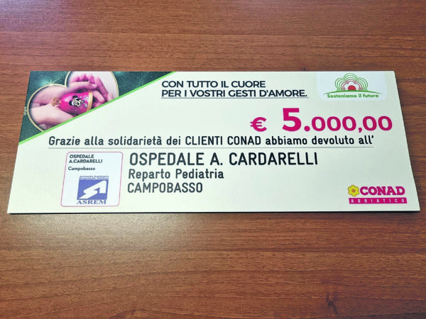 “I gesti d’amore si fanno sentire”: con questa iniziativa la cooperativa Conad Adriatico ha donato alla S.C. di Pediatria del presidio ospedaliero Cardarelli di Campobasso cinquemila euro. Ieri mattina la consegna dell’assegno simbolico al primario Francesco Crispino da parte del responsabile Sviluppo Abruzzo-Molise di Conad Adriatico, Vittorio Di Carlo e del gestore Conad di Campobasso, Enrico Barone.