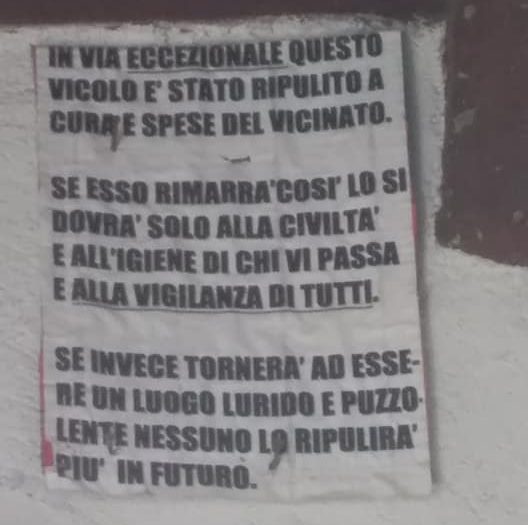 Al termine delle operazioni, però, hanno deciso anche di lanciare un messaggio ai furbetti del quartiere: «In via ‘eccezionale’ – si legge nel cortese messaggio lasciato all’ingresso della strada – questo vicolo è stato ripulito a cura e spese del vicinato. Se esso rimarrà così lo si dovrà solo alla civiltà e all’igiene di chi vi passa e alla vigilanza di tutti.
