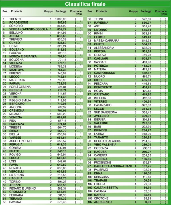 «Reginetta d’Italia – si legge su Italia Oggi- è Trento, un primato, quello della provincia autonoma, che ricalca un successo ormai consolidato negli anni. Agli antipodi, Agrigento: caso paradigmatico di realtà del Sud con problemi strutturali atavici irrisolti, figura nell’ultimo posto della classifica.