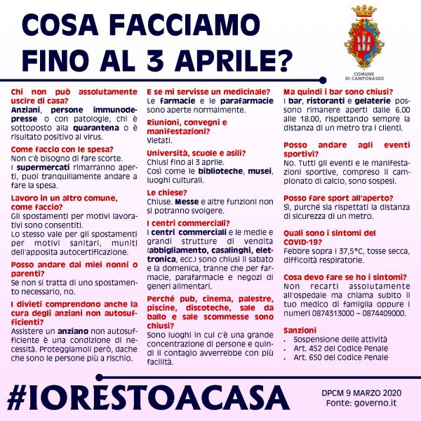 Si tratta sostanzialmente di alcune precisazioni utili a comprendere meglio le varie disposizioni che producono effetto dalla data del 10 marzo 2020 e fino al 3 aprile 2020. «Anche il Molise e la nostra città, sono diventati da oggi zone a controllo rafforzato – ha dichiarato il sindaco Gravina – Valgono quindi anche a Campobasso le nuove regole per ciò che concerne le attività di