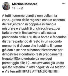 Una volta scelti i prodotti, del valore di 72 euro, una delle due ha pagato utilizzando una banconota da 50, una da 20 e una moneta da 2 euro. Ma nell’istante in cui mia figlia stava facendo lo scontrino in cassa la ragazza l’ha bloccata dicendo che avrebbe aggiunto anche un paio di orecchini esposti davanti al banco, dal valore di 7 euro, chiedendo poi il resto delle 50 euro con cui avrebbe saldato gli orecchini sostenendo di averli appoggiati sul bancone».
