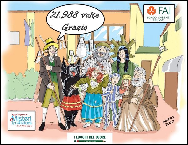 Orgoglioso del risultato ottenuto, che pone in evidenza il grande amore dei molisani nei confronti dell’antica tradizione portata avanti con passione e professionalità dalla famiglia Teberino, il Museo dei Misteri ha rivolto un ringraziamento speciale agli elettori con una vignetta a firma di Griffo 2020 che riporta alcuni dei personaggi chiave degli Ingegni che rivolgono 21.988 grazie a chi ha fatto del museo di via Trento il proprio luogo del cuore.