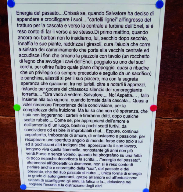 «Energia del passato», scrivono i due turisti, che non è quella della vecchia centrale idroelettrica ma proprio quella che anima Salvatore Campanella, con quella sua dedizione senza sosta.