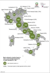 Nel dettaglio, sono 2.403 i beni culturali censiti in provincia di Isernia: di questi 544 a rischio in aree a pericolosità da frana molto elevata, 55 in aree a rischio elevato, 45 in aree a rischio medio e 61 in aree a rischio moderato. Sono 174 i beni culturali a rischio in aree di attenzione. Il 24% dei beni culturali presenti in provincia di Isernia si trova quindi in zone a pericolosità da frana elevata e molto elevata, il 36% in zone a rischio.