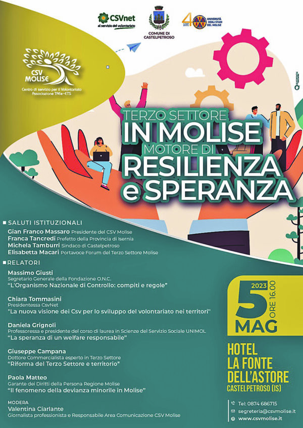 «Terzo Settore in Molise, motore di resilienza e speranza» è infatti il titolo del convegno che sarà aperto dai saluti del presidente del CSV Molise Gian Franco Massaro e della prefetta di Isernia Franca Tancredi e che ha ottenuto il patrocinio dell’Università degli Studi del Molise, del Comune di Castelpetroso e di CSVnet.