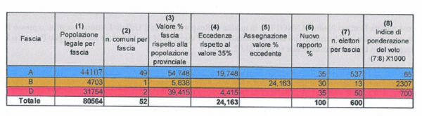 Con determina numero 2 del 12 marzo, intanto, è stato approvato anche l’indice di ponderazione per fasce demografiche in cui sono ripartiti i comuni della provincia. Ammonta a 65 il valore di ogni voto per gli elettori dei comuni di fascia A; 2307 il voto per Agnone, unico comune di fascia B; 700 ogni voto invece per Isernia e Venafro, i due comuni di fascia D. Agnone, dunque, potrà esprimere in totale 29991 voti ponderati, contro i 35mila di Isernia e Venafro messi insieme e i 34905 dei restanti 49 comuni della provincia.