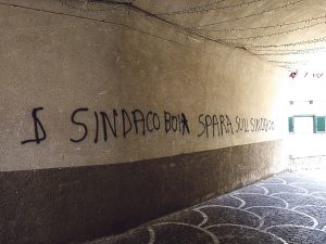 «Spara sul sindaco», la lunga striscia di minacce corre lungo le pareti che reggono l’arco che conduce alla piazza principale del piccolo centro, a poche decine di metri dalla casa comunale. Comparse ieri mattina, vergate con lo stesso spray nero e dalla stessa mano, hanno subito creato subbuglio in paese. Lui, il sindaco definito da questa mano ignota “assassino” (anche se con quale errore grammaticale) si dice sereno e fiducioso che si tratti solo di un gesto di esasperazione di