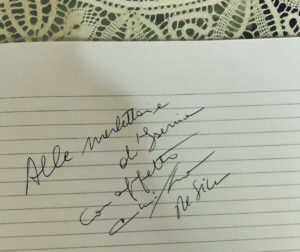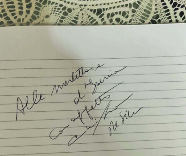 E in quel tempo sospeso, chiuso nel suo piumino invernale, l’incontro con l’arte del merletto, con le donne e gli uomini che hanno riportato il tombolo ad un nuovo domani. Una macchina del tempo quella che le merlettaie hanno attivato durante la pandemia, quando hanno tirato fuori dai bauli fuselli e attrezzi vari e a distanza hanno creato una comunità viva, pulsante, che ha restituito alla città e alla regione quella cultura della bellezza e della manualità che sembrava smarrita, il ritmo lento scandito da quel suono così tipico e unico, la socializzazione, il senso di comunità. E, in questo viaggio a cavallo tra ieri e domani, hanno restituito a tutti l’arte del tombolo. La stessa che il famoso attore italiano, reduce dal successo de «I limoni d’inverno», un cortometraggio di Caterina Carone che gli restituisce una nuova dimensione di dolore e fragilità, ha conosciuto nei racconti delle merlettaie che lo hanno accolto e ringraziato della visita. E lui, sorridente e felice di questa conoscenza, non ha detto no alla foto ricordo. E alla dedica sul libro delle visite.