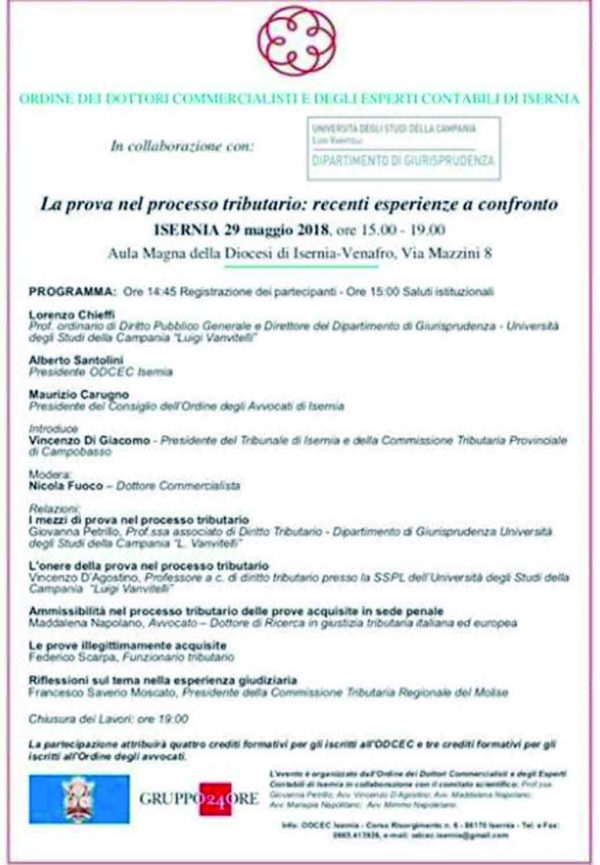 Il programma. La registrazione dei partecipanti è prevista alle 14.45. Alle ore 15 i saluti istituzionali di Lorenzo Chieffi (docente ordinario di Diritto Pubblico), Alberto Santolini (presidente Odcec Isernia), Maurizio Carugno (presidente dell’Ordine degli avvocati). La parola passerà quindi al presidente del Tribunale di Isernia Vincenzo Di Giacomo per l’introduzione. Si entrerà quindi nel vivo dei lavori con gli interventi curati da Giovanna Petrillo (professoressa associata di Diritto Tributario), Vincenzo D’Agostino (professore di Diritto Tributario), Maddalena Napolano (avvocato), Federico Scarpa (funzionario tributario) e Francesco Saverio Moscato (presidente della commissione tributaria regionale del Molise). A fare da relatore sarà invece il commercialista Nicola Fuoco. La conclusione dei lavori è prevista per le ore 19.