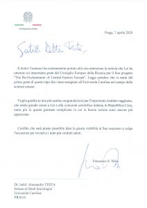 «Ho ottenuto anche un invito per una premiazione all’Istituto Italiano di Cultura a Praga che si terrà a ottobre» aggiunge Alessandro, «nonché una lettera dell’Ambasciatore Italiano in Repubblica Ceca». L’isernino, bisogna aggiungere, è il primo ricercatore della Repubblica Ceca a raggiungere un obiettivo di questo genere.