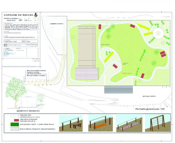 Sarà inoltre realizzato anche un percorso vita attrezzato, destinato alla pratica di attività fisico-sportive, con finalità ludico-ricreative e di benessere fisico o di attività terapeutica o riabilitativa, a completamento dell’offerta turistica tematica relativa al progetto “Riccia: il Borgo del Benessere”.