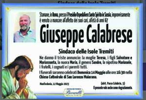 Messaggi di cordoglio e ricordi personali continuano ad arrivare per esprimere vicinanza ai familiari del sindaco delle Isole Tremiti, venuto a mancare nella giornata di venerdì 12 maggio. A nome di tutta l’amministrazione comunale, il sindaco di Termoli Francesco Roberti ha inteso esprimere massimo cordoglio per la scomparsa del primo cittadino delle Isole Tremiti Giuseppe Calabrese avvenuta alcuni giorni fa. «Esprimo le mie più sentite condoglianze – ha detto il Sindaco Francesco Roberti – per la scomparsa di Giuseppe Calabrese. Non era solo il sindaco delle Isole Tremiti ma anche un amico con il quale spesso ci confrontavamo. In questo momento così difficile esprimo, anche a nome dell’amministrazione comunale e della Città di Termoli, le più sentite condoglianze alla famiglia Calabrese e alla comunità delle Isole Tremiti».