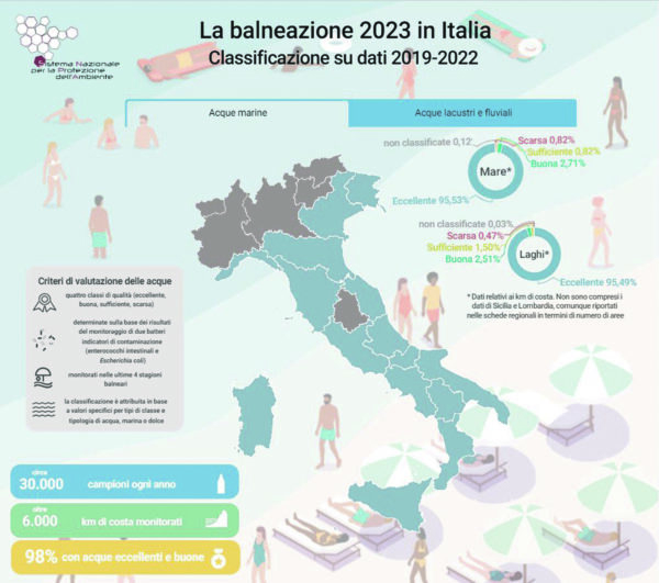 sanitario. La qualità delle acque di balneazione marine è in generale di buon livello in tutte le regioni, con percentuali di costa “eccellente” che in ogni territorio superano l’85%, con punte superiori al 99% in due regioni (Puglia e Sardegna). I controlli riguardano anche laghi e (in pochi casi) fiumi, dove alcune regioni raggiungono il 100% di acque eccellenti. A livello europeo le acque italiane risultano migliori della media dei paesi UE, sulla base dei dati elaborati dall’Agenzia europea dell’ambiente. Il lavoro di controllo e monitoraggio condotto da Snpa – Sistema nazionale per la protezione dell’ambiente – scaturisce dalla direttiva comunitaria 2006/7/CE, che stabilisce le regole della classificazione delle acque di balneazione nelle quattro classi di qualità (eccellente, buona, sufficiente e scarsa). I parametri microbiologici su cui si basa il monitoraggio sono le concentrazioni di Escherichia coli ed enterococchi intestinali, batteri ritenuti appunto indicatori di contaminazione fecale. Le percentuali riportate sono riferite al totale delle acque monitorate, escludendo dunque quelle non sottoposte al monitoraggio, ad esempio i tratti di mare che ospitano porti, servitù militari, aree protette. Per Lombardia e Sicilia – dove il monitoraggio è svolto dal sistema sanitario – i dati disponibili sono espressi solo in termini di numero di acque di balneazione e non di chilometri di costa come per le altre. Sono iniziati già da diverse settimane i campionamenti 2023 e proseguiranno per tutta la stagione estiva. Gli esiti delle analisi vengono pubblicati sui siti delle singole Arpa e sul portale “Acque” del ministero della Salute. Secondo le procedure previste dalla normativa, i risultati vengono trasmessi alle autorità locali per l’emanazione di eventuali misure, anche temporanee, utili a prevenire rischi per la salute, compresi i divieti temporanei di balneazione. A tutela della salute dei bagnanti, la norma prevede anche un monitoraggio di sorveglianza per specie algali potenzialmente tossiche. In particolare, nelle acque marino costiere, le Arpa costiere con il coordinamento di Ispra effettuano un monitoraggio della microalga bentonica potenzialmente tossica Ostreopsis cf. ovata. Per quanto riguarda la sorveglianza algale nelle acque di balneazione lacustri, “sorvegliati speciali” sono i cianobatteri: batteri fotosintetici, produttori di ossigeno, chiamati anche alghe azzurre o blu-verdi, in quanto il loro colore varia dall’azzurro, al rosso al porpora. I risultati sulla presenza delle varie specie sono consultabili sui siti delle agenzie regionali nelle sezioni dedicate alle acque di balneazione. Intanto, si attende anche l’arrivo di Goletta Verde, il vascello simbolo di Legambiente, che è atteso a Termoli il 27 e 28 luglio. In quella data, oltre a svelare i dati sul loro campionamento delle acque, si punterà sui temi messi a fuoco nel rapporto “Mare Monstrum”, che nel Molise vede 78 reati rilevati su 2.761 controlli, pari all’1,6% del totale nazionale. In particolare, 80 le denunce, 33 i sequestri e 133 gli illeciti amministrativi scoperti, di cui 132 con relative sanzioni. Legambiente analizzati i dati delle forze dell’ordine e della Capitaneria di Porto (esclusi quelli della Guardia di Finanza). Il viaggio della Goletta Verde rileva con monitoraggi scientifici la qualità delle nostre acque denunciandone anche la cattiva depurazione. Un viaggio, iniziato oltre 30 anni fa, lungo tutte le coste italiane, per difendere la bellezza del nostro Paese che vede impegnati tantissimi volontari per monitorare l’inquinamento dei nostri mari e decine di attività, incontri, laboratori, mobilitazioni. Perché amiamo il mare e vogliamo proteggerlo. Quella di Goletta Verde è una missione contro illegalità, cementificazione, fonti fossili, mala depurazione e rifiuti. Quest’anno al centro della campagna la lotta alla crisi climatica, la promozione delle energie rinnovabili e dell’eolico off-shore. In Italia il 25% della popolazione non è servita da un adeguato servizio di depurazione. Scarichi non depurati che, purtroppo, finiscono nei nostri mari. Un problema che si somma a plastiche, microplastiche, scarichi illegali ed ecomafie. Inquinamento, abusivismo edilizio, mala depurazione, cattiva gestione dei rifiuti, assalto al patrimonio ittico e alla biodiversità: tutte facce della pressione illegale sull’ecosistema marino del nostro Paese. Dati anteprima “Mare Monstrum”. Nel 2022 lungo le coste italiane sono state 13.229 le infrazioni contestate, pari a 1,8 violazioni per ogni chilometro di costa. Crescono nel 2022 gli illeciti amministrativi, pari a 8.499 (+24,2% rispetto al 2021) e le sanzioni amministrative, 8.935 quelle comminate (+ 47,7% rispetto al 2021). In diminuzione, invece, il numero di reati (4.730, -32,9% sul 2021) e il numero delle persone denunciate o arrestate (4.844, -43,6% rispetto al 2021) e quello dei sequestri (1.623, -51,7% rispetto il 2021), per un valore economico di oltre 385 milioni di euro. Le 5 proposte. Secondo il cigno verde è urgente procedere verso la piena ed effettiva depurazione delle acque reflue attraverso 5 azioni: 1) rilanciare a livello nazionale e locale la costruzione e l’adeguamento e/o messa in regola dei sistemi fognari e di depurazione, migliorando l’intero sistema di gestione, integrando il ciclo idrico (collettamento fognario e depurazione) con quello dei rifiuti (gestione fanghi di depurazione); 2) efficientare la depurazione delle acque reflue, valorizzandole come risorsa e permettendone il completo riutilizzo in settori strategici come l’agricoltura superando gli ostacoli normativi nazionali (DM 185/2003) con l’attuazione del regolamento UE 741/2020; 3) rafforzare e rendere più efficienti i controlli delle Agenzie regionali di protezione ambientale messe in rete nel Sistema Nazionale di protezione ambientale, coordinato da Ispra (SNPA) e i controlli delle forze dell