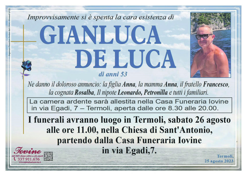 Come anticipato ieri, si celebrano oggi, alle 11, nella chiesa di Sant’Antonio, partendo dalla casa funeraria Iovine, i funerali di Gianluca De Luca. Ieri mattina diffuso anche l’annuncio funebre: Ne danno il doloroso annuncio: la figlia Anna, la mamma Anna, il fratello Francesco, la cognata Rosalba, Il nipote Leonardo, Petronilla e tutti i familiari. La prematura scomparsa di Gianluca De Luca lascia dolore e sgomento non solo nella comunità termolese ma anche negli amici e clienti del Lido Anna, dove Gianluca era titolare. Dalle esperienze vissute nell’ambito del “Progetto Atlantide”, il presidente della sezione di Termoli dell’Archeoclub d’Italia, Oscar De Lena, ha diffuso un ricordo di Gianluca De Lena. «Il mio pensiero e il mio ricordo vanno a Gianluca De Luca, il sub scomparso il 23 agosto alle Isole Tremiti e ritrovato giovedì 24 agosto, senza vita, tra gli scogli dell’isola di San Domino. Gianluca, per la sua vasta esperienza come sub, aveva collaborato con noi al Progetto Atlantide… alla ricerca dell’antica città di Buca” (l’antica Termoli forse scomparsa per bradisismo sotto il nostro mare nella zona dell’Aspro) e poi si era reso sempre disponibile quando per accontentare i turisti olandesi che volevano visitare i trabucchi, ci accoglieva su quello di FE.DE. per raccontarci la storia di questi antichi mezzi di pesca e come si operava su di essi. Grazie Gianluca per la tua sempre disponibilità. Ti ricorderemo sempre con tanto affetto. Le nostre più sentite condoglianze ai familiari. Allego una foto di quegli indimenticabili giorni».
