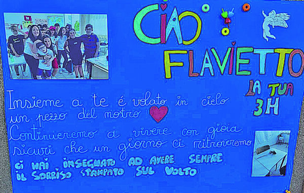 nostri cuori. Sarai per sempre il nostro grande guerriero». Con queste parole viene annunciato il funerale del piccolo Flavio, domani, giovedì 21 dicembre, nella chiesa di San Timoteo alle 15. La camera ardente sarà allestita in via dei Roveri, dalle 9 di oggi. La Procura ha deciso così di non eseguire l’esame autoptico. Ma numerose sono state le testimonianze di vicinanza alla famiglia. «Flavio, cucciolo mio, voglio ricordarti come la settimana scorsa al centro, mentre Sara ti salutava con il suo abbraccio forte che ti faceva ogni volta che ti vedeva. Ti vogliamo bene. Amica mia mi stringo a te, al tuo dolore». da Barbara Molinaro, con Sara. L’’associazione ARK 21 & MORE si stringe alla famiglia del piccolo Flavio, per la sua perdita, in un caloroso abbraccio. «Ciao Flavio: porteremo per sempre nei nostri cuori il ricordo di te. Con immenso dolore e ancora tanta incredulità, l’Associazione Oltre il blu saluta il piccolo Flavio, salito al cielo troppo presto a seguito di un tragico incidente». Messaggio anche dalla Faisa-Cisal: «Costernati apprendiamo della tragica morte del ragazzo di 13 anni vittima di un incidente stradale avvenuto ieri sulla Statale 16». Così la Faisa-Cisal a seguito del terribile incidente avvenuto nel pomeriggio di ieri, lunedì 18 dicembre, sulla Statale 16 in territorio di Petacciato. «In questo momento di grande dolore, desideriamo esprimere la nostra più sincera solidarietà alla famiglia, affinché possano trovare la forza di affrontare questo momento insostenibile. Vogliamo estendere la nostra solidarietà anche al collega alla guida dell’autobus coinvolto nell’incidente. Questi professionisti, poco considerati dalle aziende e dalle istituzioni, svolgono un compito cruciale nel nostro quotidiano, mettendo la propria responsabilità al servizio della comunità. Oggi, più che mai, riflettiamo sulle difficoltà di questo lavoro, costantemente esposto a pericoli». Il banco rimasto vuoto, a scuola, nella sezione 3^ H, lascia senza parole. «Ciao Flavietto, sei il nostro bell’angelo delicato e amorevole», su cui è stato deposto un fiore. I suoi compagni hanno preparato un cartellone, per scolpirne il ricordo in modo indelebile, con una grande foto che lo ritrae assieme a loro.