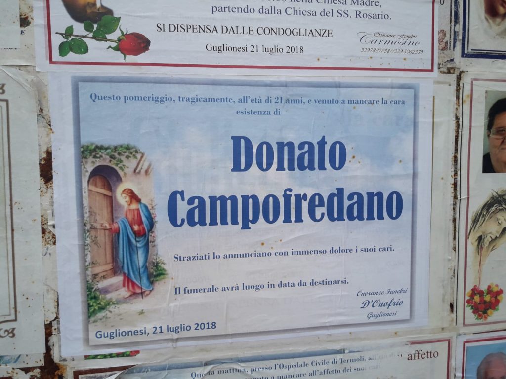 Il Pm della Procura di Larino, titolare del fascicolo sulla morte del 21enne Donato Campofredano, ha disposto l’autopsia sul cadavere del centauro di Guglionesi, rimasto vittima di una uscita di strada sabato intorno all’ora di pranzo sulla statale 16, poco dopo il semaforo di Petacciato scalo. La moto condotta dal ragazzo è schizzata via dopo aver urtato una macchina per schiantarsi contro un camper. L’esame autoptico, di cui deve essere ancora formalizzato l’incarico al medico legale dell’istituto di Foggia, potrebbe avvenire non prima di giovedì o venerdì. Intanto, dopo la decisione di proclamare il lutto cittadino, il sindaco di Guglionesi Mario Bellotti ha rivolto un pensiero ai cari di Donato. «L’intera comunità si stringe intorno alla famiglia di Donato – dichiara Bellotti – che ha subito un dolore che non ha parole per essere descritto. Però lo strazio di questo momento non ci esime dal porci una domanda che ci angoscia: come comunità, potevamo fare di più per evitare che ciò accadesse, cosa possiamo fare affinché simili tragedie non accadono in futuro?»