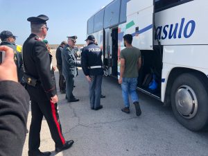A Foggia adulti e bambini sono stati identificati e destinati a centri di accoglienza del posto. A scortare il bus Polizia, Carabinieri e Guardia di Finanza.