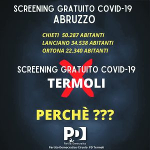 vicino Abruzzo, abbiamo trovato questi eventi mirati di screening della popolazione. Lanciano, 34.500 abitanti, tamponi antigienici il 30 e 31 gennaio, il 6 e 7 febbraio; Ortona, 22.000 abitanti, tamponi rapidi il 30 e 31 gennaio; Fossacesia, 30 e 31 gennaio, 6 e 7 febbraio; Chieti, 50.000 abitanti: test rapidi il 6, 7, 13 e 14 febbraio. Lo screening si è sviluppato su tutta la provincia di Chieti, con un piano concordato con Asl e Prefettura. I test sono stati fatti anche ai ragazzi delle scuole superiori. “Fare il tampone rapido antigienico è una scelta civica ed una dimostrazione di attenzione e cura verso la comunità e i propri cari”. Questo dice Diego Ferrara, sindaco di centro sinistra di Chieti. Aspettiamo parole di cura e azioni concrete anche dal sindaco/presidente Roberti e dalla sua amministrazione, sempre meno di centro e sempre più di destra. Ma, fino ad ora, ci siamo solo sentiti dire che la colpa è degli altri». Il gruppo consiliare di Forza Italia ha inteso replicare alla nota inviata alla stampa dal segretario cittadino del Partito Democratico Maria Chimisso. «In riferimento alla ricorrente “Campagna di sensibilizzazione” da parte del Pd a voce della sua segretaria Maricetta Chimisso occorre evidenziare quanto segue: Lo screening a cui si riferisce la segretaria Dem viene promosso dall’Asl 2 “Lanciano-Vasto-Chieti” effettuando tamponi antigenici per tutti coloro che vogliono volontariamente sottoporsi dai 6 anni in su. Tale campagna viene effettuata dunque dall’Asl e non dal Comune di Chieti a guida Pd come vorrebbe far sembrare la signora Chimisso e nulla ha a che vedere con eventuali emendamenti o proposte di consiglio comunale. Tale screening è già stato fatto anche dall’Asrem molisana su tutta la Provincia di Campobasso, coinvolgendo la scorsa estate il Comune di Termoli. Probabilmente alla Chimisso tali circostanze sono sfuggite o forse era ancora in vacanza. Lo scopo era sensibilizzare i tanti giovani prima della ripresa delle attività scolastiche e verificare quale fosse la situazione epidemiologica sul territorio. Infatti è bene ricordare che prima dell’avvio del corrente anno scolastico la Regione Molise, il 24 agosto scorso, ha avviato il Programma di screening relativo all’effettuazione, su base volontaria, di test sierologici sul personale docente e non docente, operante nei nidi, nelle scuole dell’infanzia, primarie e secondarie pubbliche, statali e non statali, paritarie e private e negli istituti di istruzione e formazione del Molise. Inoltre a Termoli, il 3 ottobre scorso è stata promossa anche la campagna “Movida Covid free” riservata ai giovani di età compresa tra i 18 e i 35 anni. In quell’occasione si sottoposero allo screening 498 persone, tre risultarono positive. A poco può servire la comunicazione per chi vuole essere sordo ma la Chimisso, nonostante la sua innata inclinazione alla comunicazione, mistifica i fatti salvo poi fare brutte figure quando puntualmente mente sapendo di mentire. E’ opportuno evidenziare che anch’ella ricopre un doppio ruolo, segretaria Dem e dirigente scolastico; in quest’ultima veste dovrebbe sapere che anche lei ha l’onere di svolgere una campagna di sensibilizzazione ai tanti studenti che il pomeriggio affollano le piazze e le strade del centro. Risulta del tutto evidente che, dai risultati ottenuti, la comunicazione fa poco breccia nei cuori dei tanti giovani. Per il futuro si invita ad una maggiore onestà intellettuale al fine di dare le giuste informazioni ai tanti studenti che in questo momento difficile avrebbero bisogno, soprattutto da parte degli adulti, di punti di riferimento credibili per affrontare in maniera incisiva questa pandemia». Ma il centrosinistra dem non molla la presa e coi 4 consiglieri comunali presenta interrogazione e mozione. Sono state presentate in data odierna un’interpellanza e una mozione urgente al Sindaco di Termoli. Dopo le segnalazioni di molti cittadini e l’intervento del Circolo cittadino Pd, i consiglieri comunali Pd e Vota per te hanno presentato un’interpellanza urgente al sindaco Francesco Roberti per chiedere se sono state attivate delle misure per controllare e monitorare le situazioni di assembramento che continuano a registrarsi nel centro cittadino e in altre zone della città. Se il sindaco ha intenzione di intensificare i controlli che sembrano insufficienti e se questo è stato fatto comunicare quali sono i mezzi e le misure messe in atto. In seguito all’aumento dei contagi verificatisi in città e in tutto il territorio del basso Molise nelle ultime settimane e alla chiusura delle scuole, disposta a Termoli dal sindaco con l’ordinanza del 30 gennaio, dal primo febbraio fino al 10 febbraio, a causa dell’incremento del numero di positivi al Covid anche in ambito scolastico, i consiglieri Pd e Vota per Te, insieme all’interpellanza urgente, hanno depositato anche una mozione per chiedere al Sindaco, al fine di contenere e prevenire la diffusione del virus, di attivare uno screening gratuito di massa della popolazione, eseguendo tamponi antigenici a partire dai sei anni di età. In Molise le amministrazioni di diversi Comuni (Ururi, Sant’Elia a Pianisi, Santa Croce di Magliano) hanno già messo in campo quest’iniziativa, riscontrando successo. La stessa iniziativa è stata adottata da molti Comuni dell’Abruzzo, con una popolazione uguale o superiore a quella di Termoli (Lanciano, Chieti, Fossacesia, Ortona). Si chiede al Sindaco e alla Giunta comunale di attivare velocemente lo screening gratuito di massa della popolazione con tamponi antigenici, mettendo a disposizione spazi e immobili comunali e stilando un calendario con fasce orarie e giornate dedicate. Attendiamo una risposta celere ed esaustiva dal Sindaco e dalla sua Giunta». Il sindaco Francesco Roberti, da noi interpellato, ha evidenziato la necessità di un maggiore senso di responsabilità, anche perché la mobilità sociale tra Termoli e