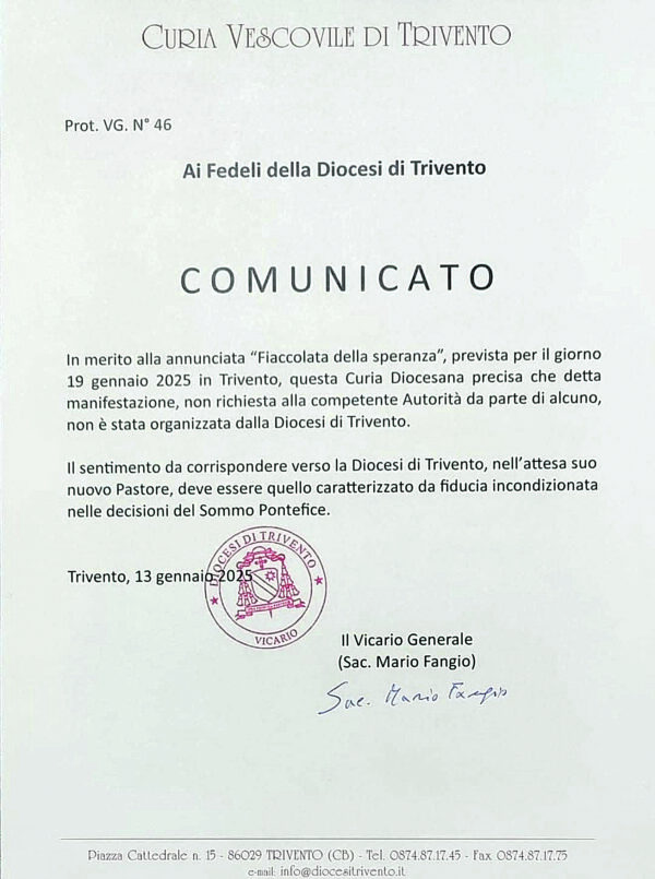 Con una lettera inviata ai fedeli della Diocesi di Trivento, la Curia vescovile prende le distanze dalla fiaccolata di domenica prossima organizzata da cittadini e associazioni per sostenere la nomina del nuovo vescovo. «Ai fedeli della Diocesi di Trivento – si legge nella lettera a firma del vicario generale Don Mario Fangio – in merito alla annunciata “Fiaccolata della speranza”, prevista per il giorno 19 gennaio 2025 in Trivento, questa Curia Diocesana precisa che detta manifestazione, non richiesta alla competente autorità da parte di alcuno, non è stata organizzata dalla Diocesi di Trivento. Il sentimento da corrispondere verso la Diocesi di Trivento, nell’attesa suo nuovo Pastore, deve essere quello caratterizzato da fiducia incondizionata nelle decisioni del Sommo Pontefice». Intanto, ieri sera c’è stata una riunione pubblica organizzata dai