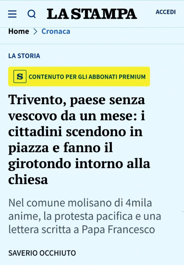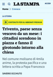 Intanto la questione è arrivata anche sui giornali nazionali. Il quotidiano “La Stampa” di Torino ha infatti dedicato un articolo alla vicenda che sta animando i cittadini di Trivento e gli altri 39 comuni della Diocesi. Nell’articolo si spiega che quella di Trivento è una delle Diocesi più piccole d’Italia per numero di abitanti ma una delle più