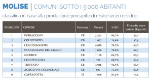 Un primo passo, ma propedeutico per superare i vecchi sistemi di smaltimento, è la raccolta differenziata. Per questo Legambiente a partire dal 2016 attraverso il concorso Comuni Ricicloni premia solo i Comuni Rifiuti Free, ovvero quelli dove la raccolta differenziata funziona correttamente, ma soprattutto dove ogni cittadino produce al massimo 75 chili di secco residuo all’anno, ovvero di rifiuti avviati a smaltimento. Sono 547 i Comuni Rifiuti Free nel 2019, in aumento rispetto all’anno precedente. E tra questi c’è anche Trivento che ha registrato una buona performance che supera abbondantemente la soglia del 70%. In tutto sono però nove i comuni ricicloni molisani che ieri sono stati premiati alla Camera di Commercio di Campobasso dove si è svolta la seconda edizione di “Ecoforum – L’economia circolare dei rifiuti”, evento organizzato da Legambiente.