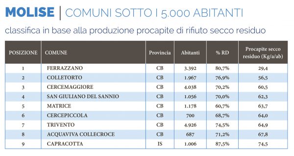Un primo passo, ma propedeutico per superare i vecchi sistemi di smaltimento, è la raccolta differenziata. Per questo Legambiente a partire dal 2016 attraverso il concorso Comuni Ricicloni premia solo i Comuni Rifiuti Free, ovvero quelli dove la raccolta differenziata funziona correttamente, ma soprattutto dove ogni cittadino produce al massimo 75 chili di secco residuo all’anno, ovvero di rifiuti avviati a smaltimento. Sono 547 i Comuni Rifiuti Free nel 2019, in aumento rispetto all’anno precedente. E tra questi c’è anche Trivento che ha registrato una buona performance che supera abbondantemente la soglia del 70%. In tutto sono però nove i comuni ricicloni molisani che ieri sono stati premiati alla Camera di Commercio di Campobasso dove si è svolta la seconda edizione di “Ecoforum – L’economia circolare dei rifiuti”, evento organizzato da Legambiente.